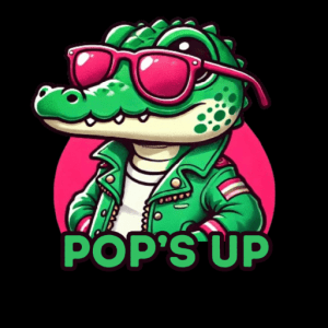 Pops Up Marketing en crocodile stylisé façon dessin animé, portant des lunettes de soleil, une veste verte et un short bleu, tenant un mégaphone. L'agence Pop's Up Marketing a inscrit ce visuel dans ses services créatifs pour illustrer des situations dynamiques de communication et marketing.